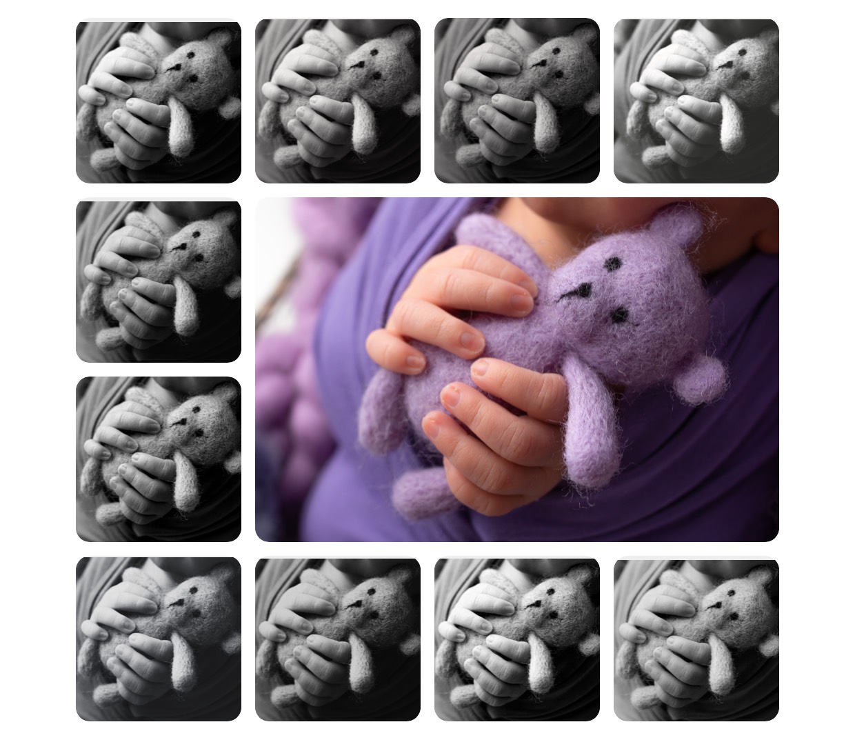 Набор из 10 чёрно-белых экшенов для Photoshop (Black and White Photoshop Actions), созданный специально для обработки фотографий новорождённых. Экшены помогают быстро получить выразительные портреты и макро-снимки с мягким контрастом и глубиной.